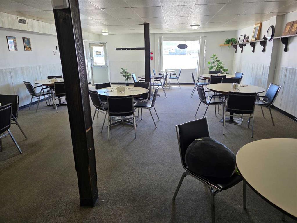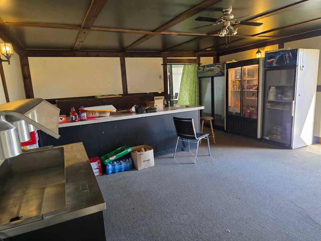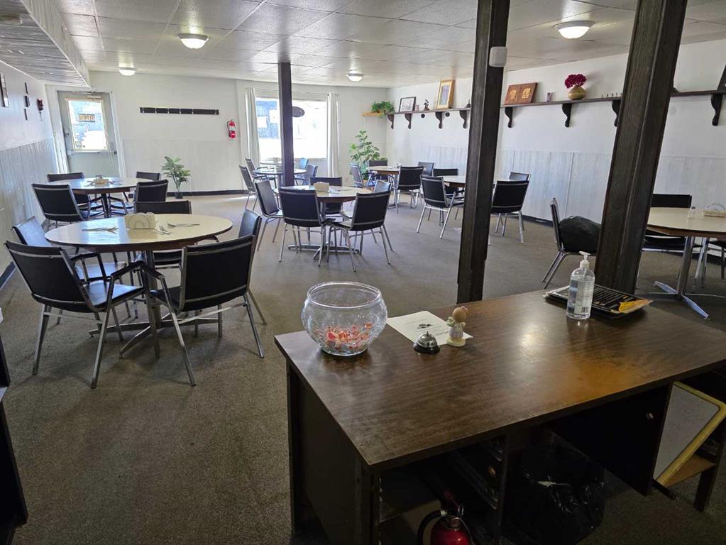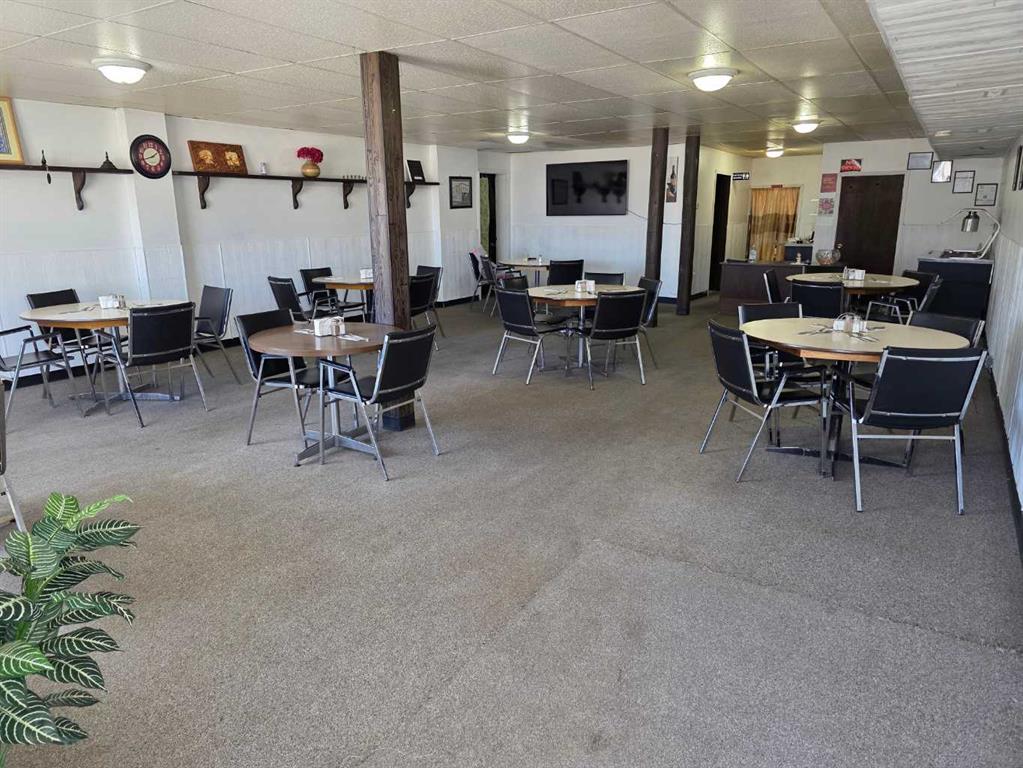 Commercial business opportunity located in the hamlet of Enchant, AB. Currently and previously used as a restaurant, this property has a large dining area and commercial kitchen on the main level with a bar room addition and lots of storage. The upper level as living quarters with 4 large bedrooms, laundry, kitchen, dining and living rooms. A large double car garage and 2 sheds are all on this property that consists of 3 lots in total.