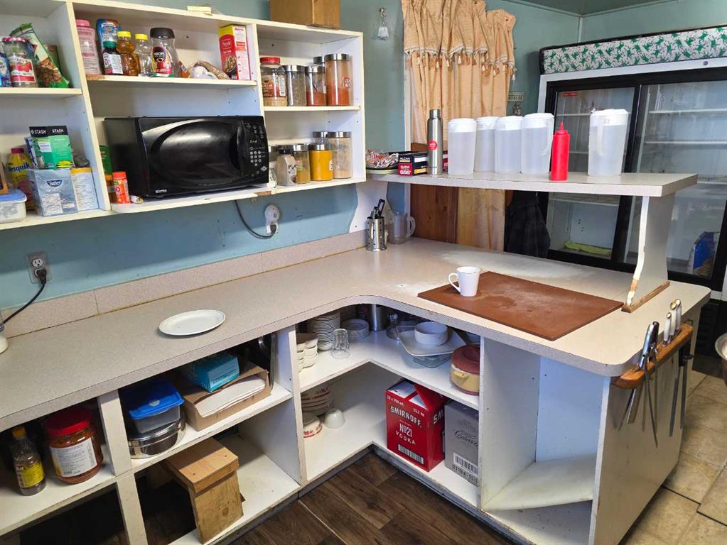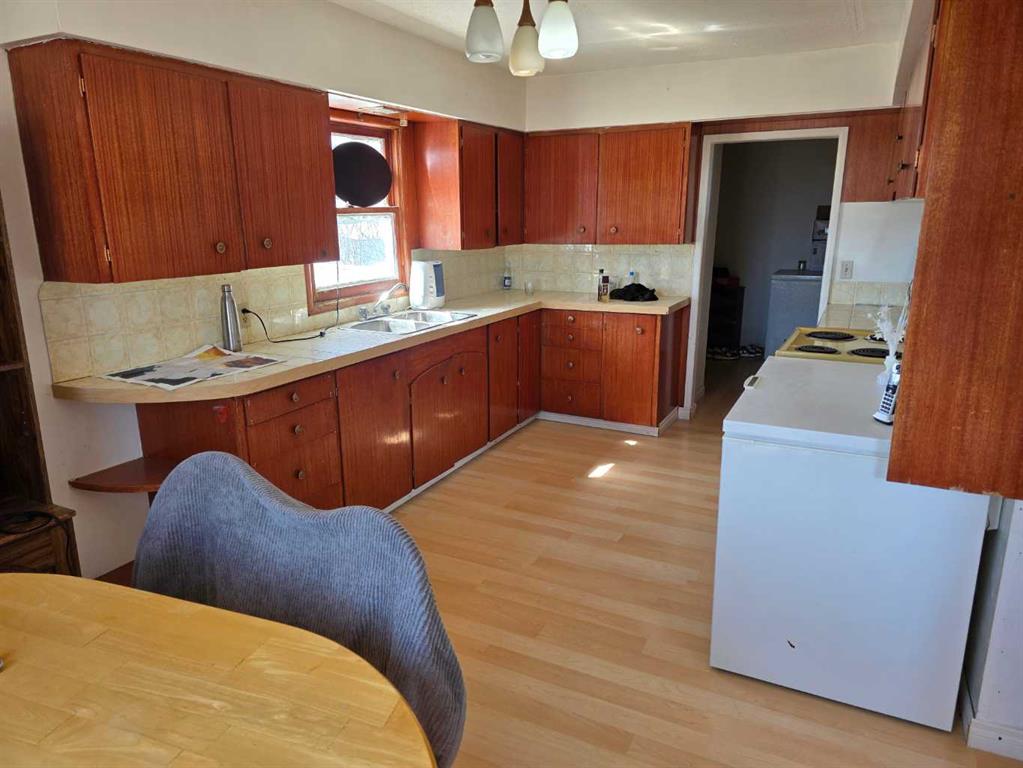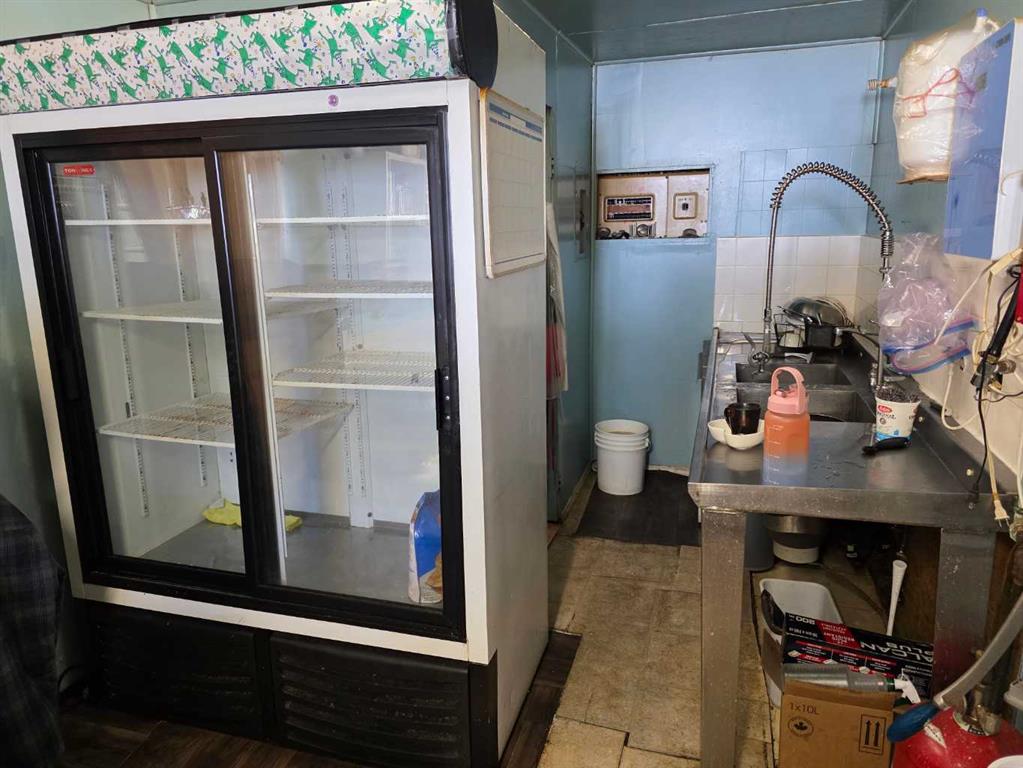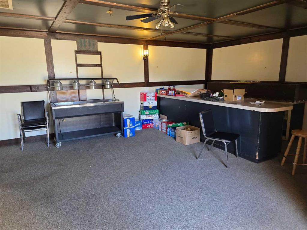 Commercial business opportunity located in the hamlet of Enchant, AB. Currently and previously used as a restaurant, this property has a large dining area and commercial kitchen on the main level with a bar room addition and lots of storage. The upper level as living quarters with 4 large bedrooms, laundry, kitchen, dining and living rooms. A large double car garage and 2 sheds are all on this property that consists of 3 lots in total.