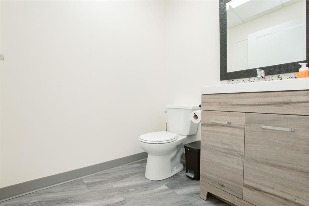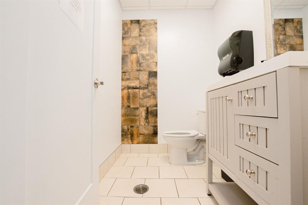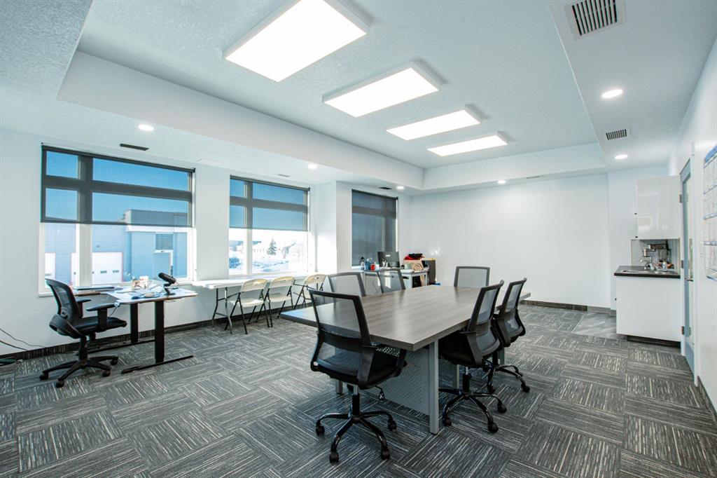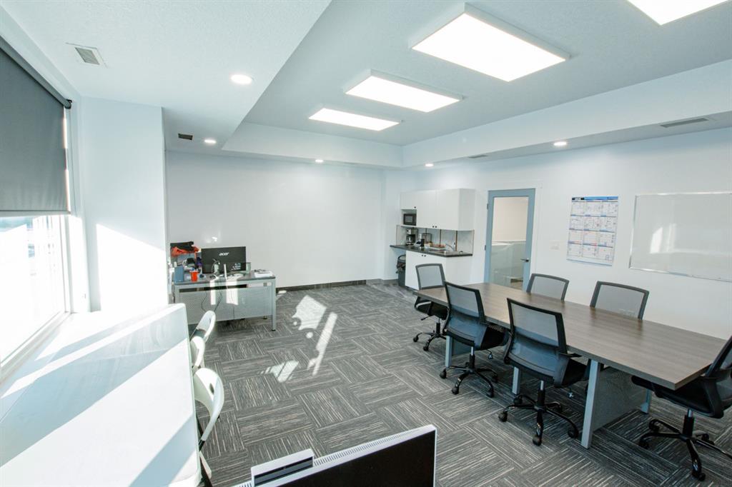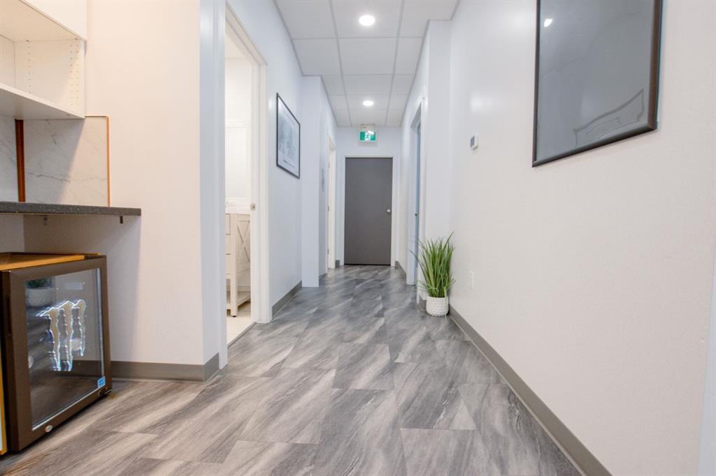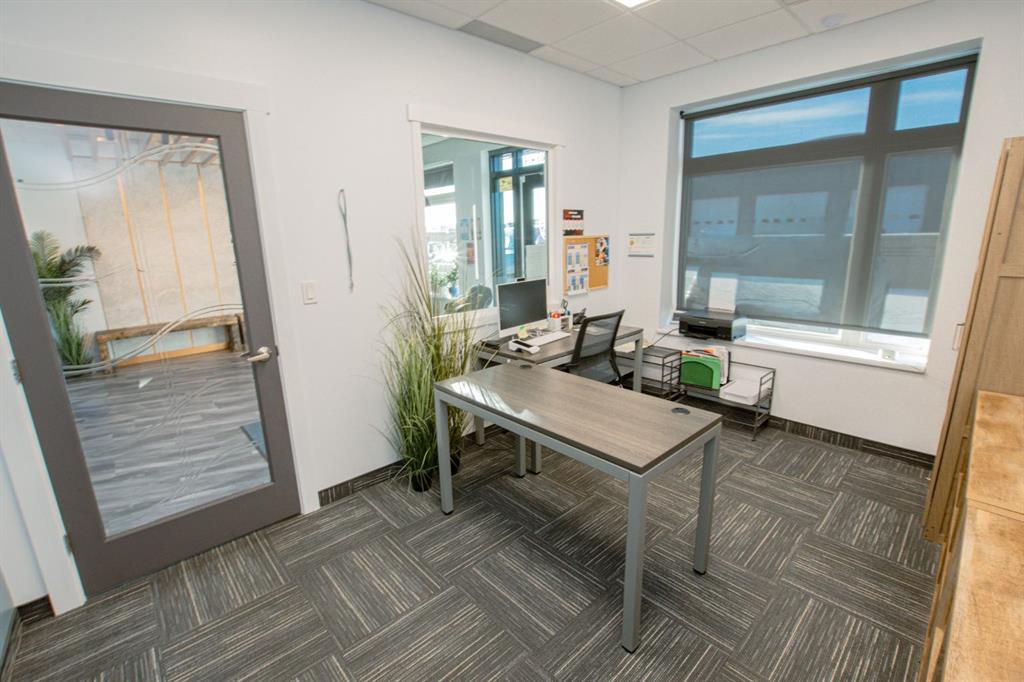 Modern commercial/office space with attached side bay featuring modern décor, contemporary color palettes, and generously sized layouts with large windows that flood the space with natural light. Constructed with ICF, this 3852 sq.ft unit offers exceptional energy efficiency for heating and cooling, as well as a remarkably quiet interior environment. Enjoy parking right to the doorstep, along with a large public parking lot. This modern facility showcases beautiful finishes throughout, including tiled washr...