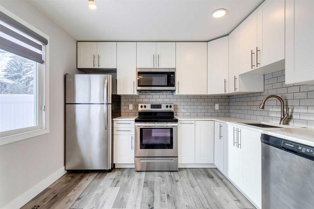 Wonderfully renovated townhome offering a bright and welcoming living space with modern laminate floors, fresh paint, and a beautifully updated kitchen featuring newer white cabinets, quartz counters, and stainless appliances. The upstairs has a renovated bathroom and three large bedrooms, including a huge primary suite with a custom built-in closet. You’ll love the private fenced yard that backs right to a greenspace. The large unfinished basement provides plenty of storage, and the furnace and water heate...