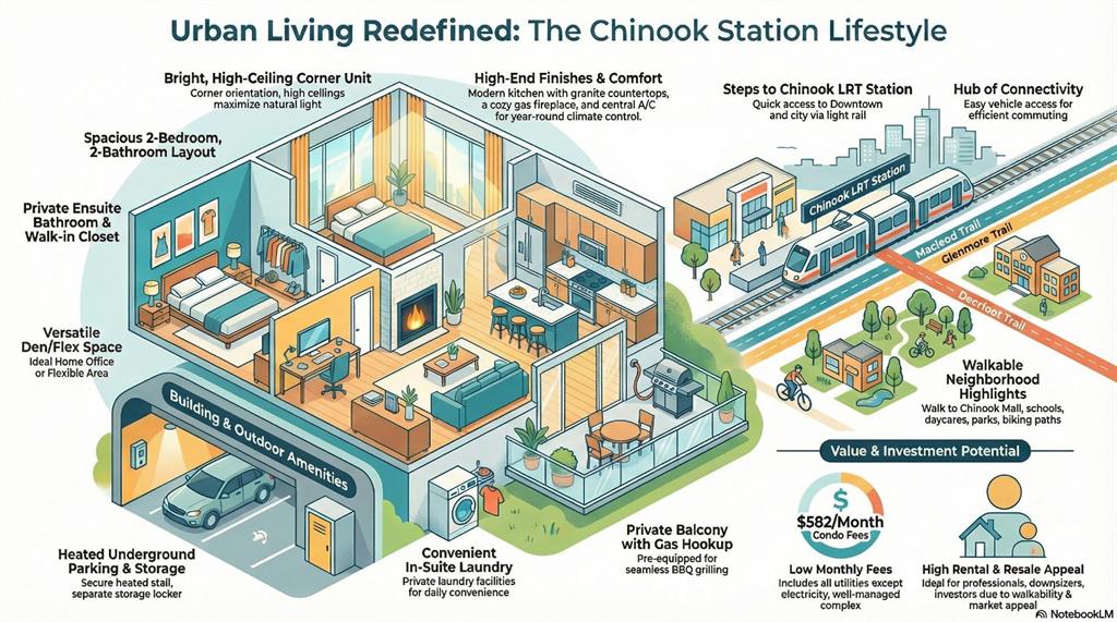 RARE Spacious 2 bedroom, 2 bathroom + Den layout *** ENSUITE bathroom and WALK-IN closet in primary bedroom *** Newer Dishwasher, Stove, and Microwave Hood Fan (Approximately 3 Years Old) *** BRIGHT corner unit with natural light *** HIGH CEILINGS *** Gas fireplace *** Central A/C *** GRANITE countertops *** In-suite laundry *** Balcony with gas BBQ hookup *** HEATED UNDERGROUND PARKING and SEPARATE STORAGE Locker, Both Forming Part of the Condo Unit Title. *** Low Condo Fees - $582/month *** All UTILITIES ...