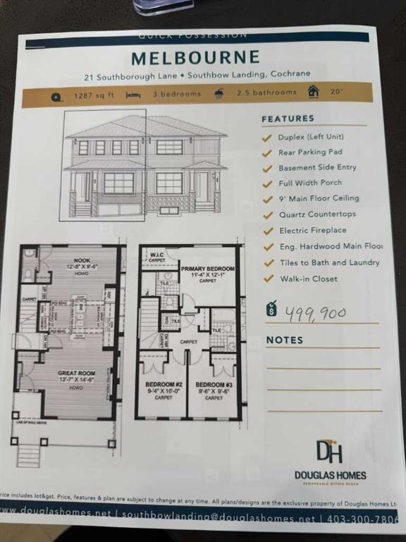 Welcome to The Melbourne – by Douglas Homes A beautifully crafted west facing semi detached 3 bedroom home located in the exciting new community of Southbow Landing in Cochrane. Main Floor Highlights include a spacious open concept layout with large, light filled great room and built in electric fireplace. The bright dining nook opens up to the heart of the home and includes a chef inspired kitchen. The kitchen includes a bright dining nook with u, pgraded 42” full-height soft-close cabinetry, quartz c...