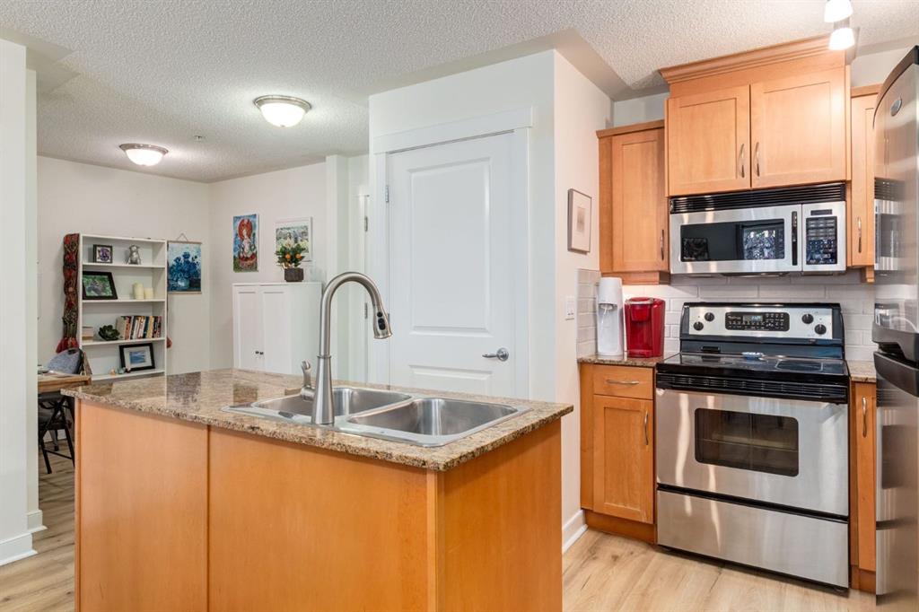 This lovely one bedroom + den is bright & spacious and includes a titled underground parking stall and titled storage cage. It has a popular open concept design with large windows and elegant laminate flooring throughout. The kitchen has maple cabinets, under cabinet lighting, a center island, quartz counters and stainless steel appliances. The dishwasher is new and the in-suite washer & dryer have been updated. You'll love hosting family and friends for meals in the dining area. The living room is spacious...