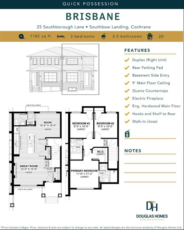 Meet The Brisbane – by Douglas Homes This masterfully built semi-detached home in Southbow Landing combines modern design with everyday comfort. Offering just under 1,200 sqft of living space, 3 bedrooms, 2.5 baths, and a full undeveloped basement with side entry, this home is designed to grow with you. With a great floor plan this home is waiting for you to make your mark. Main Floor Highlights include a bright, open concept great room with built-in electric fireplace There is a stunning kitchen featuri...