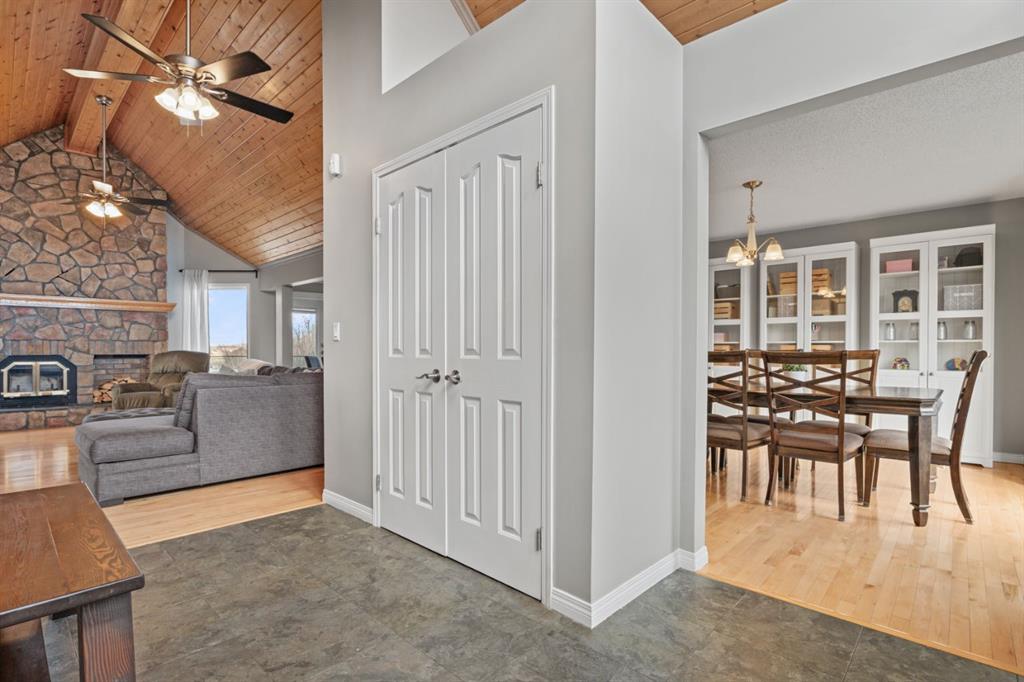 Set on 4.15 acres of private, tree filled land just minutes from Okotoks and Calgary, this fully finished walkout bungalow offers over 3,600 sq.ft. of developed living space and an exceptional blend of comfort, function, and lifestyle. The main floor welcomes you with a bright, vaulted entry and spacious living area anchored by a beautifully updated fireplace. Newer hardwood flows throughout, leading into a kitchen with lots of granite counter space, updated appliances including gas stove, and a dedicated d...