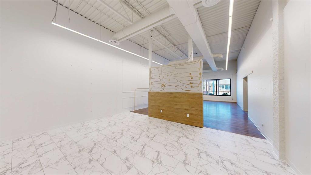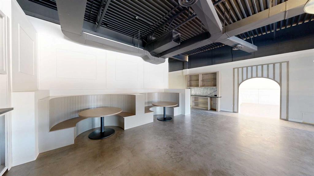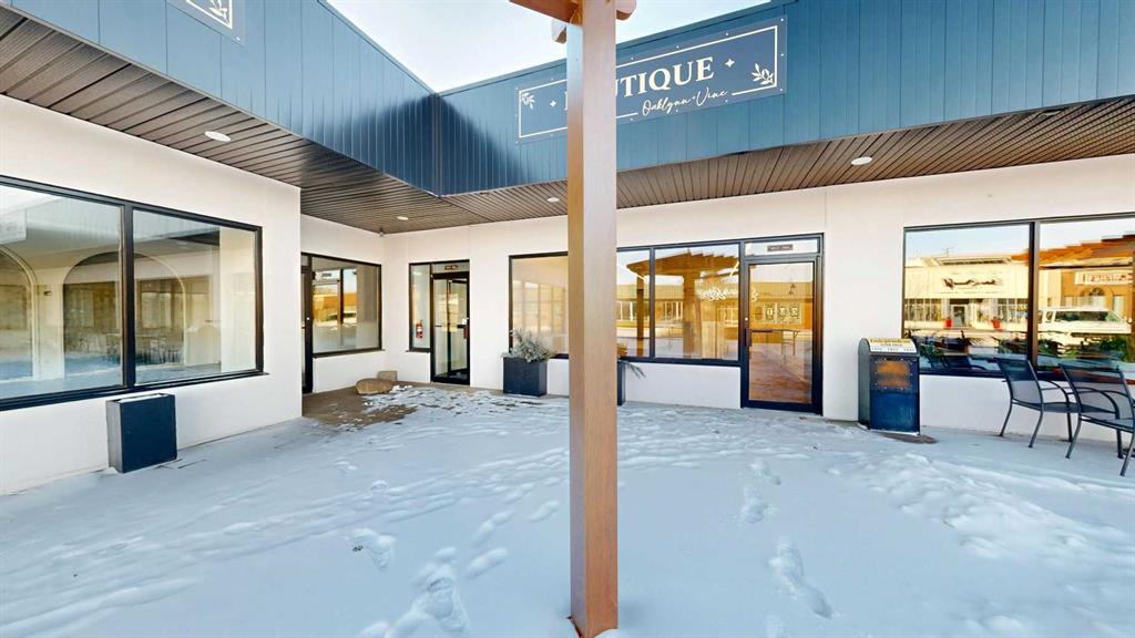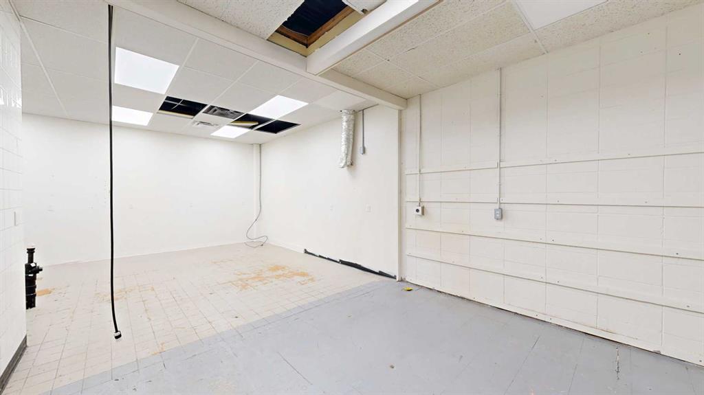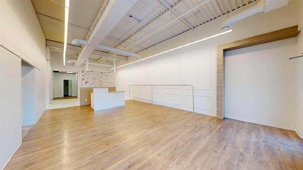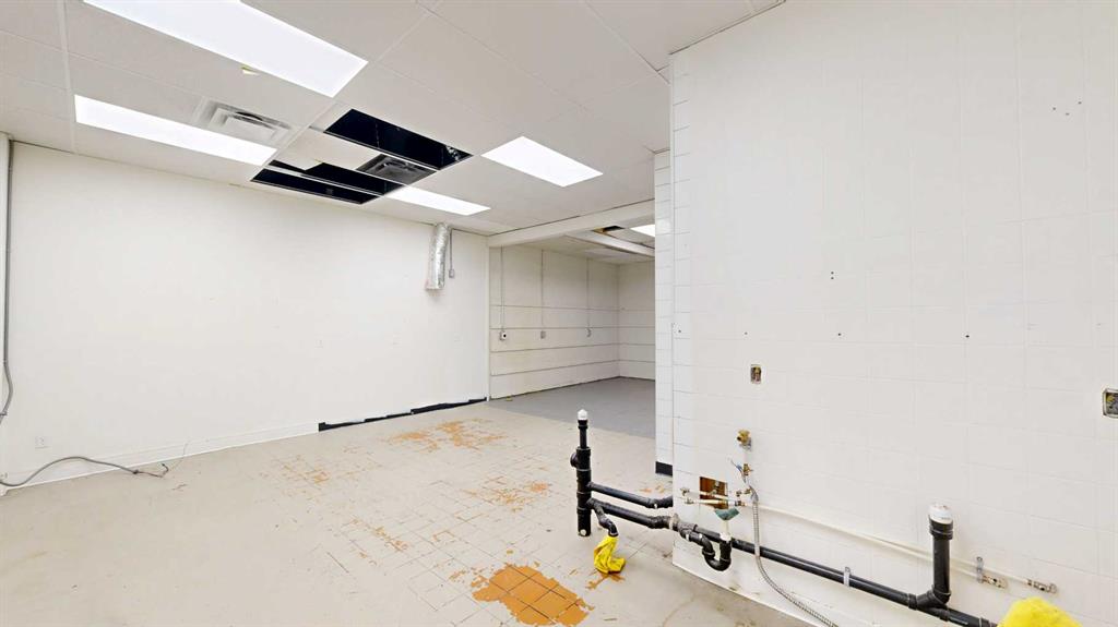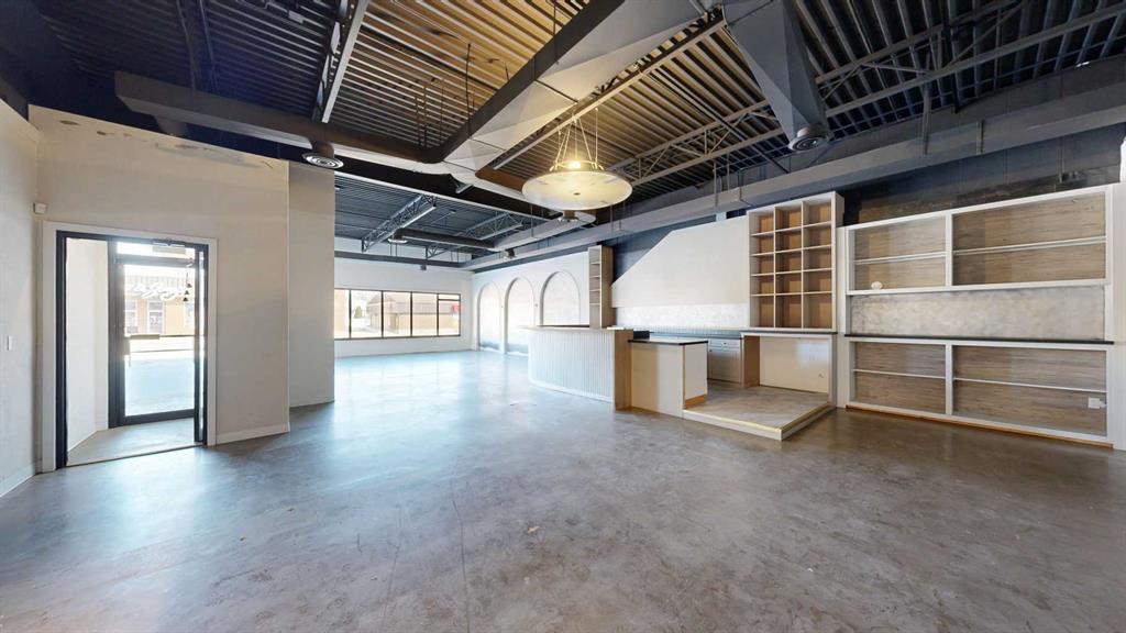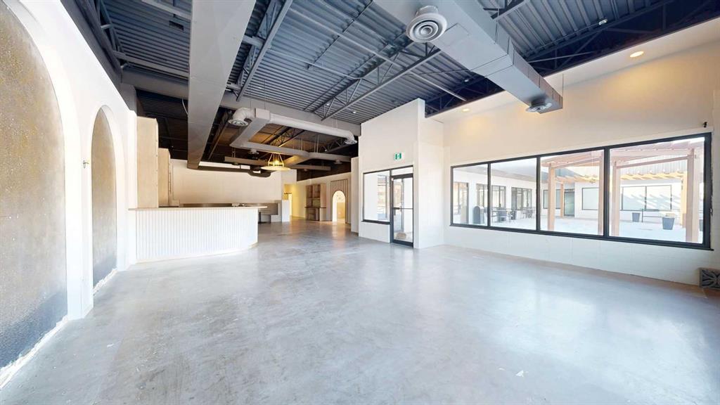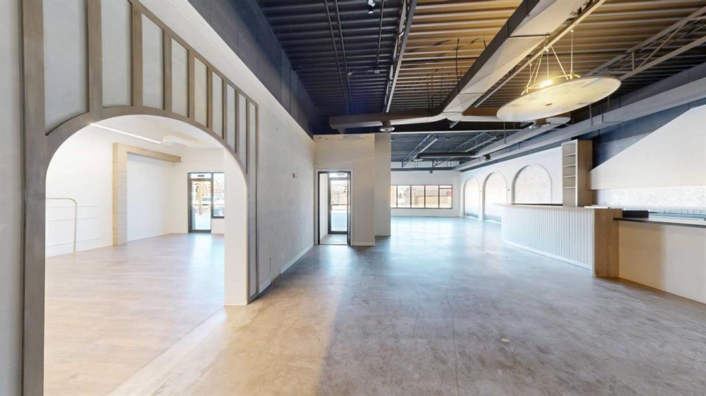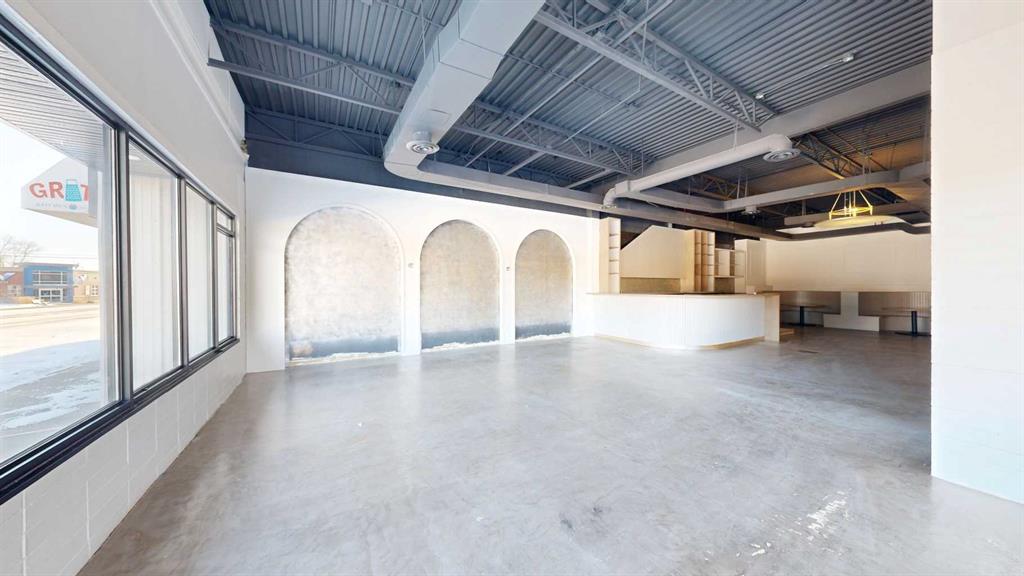 This expansive commercial property on main street in Stettler features a visually appealing and versatile layout suitable for a variety of business styles. The interior blends industrial and modern design, highlighted by exposed beams and ductwork in the high ceilings. Large windows fill the space with natural light for an open, airy feel. This property is partitioned into two main spaces, each with their own front and back doors. The south side has an open area with polished concrete floors, making the spa...