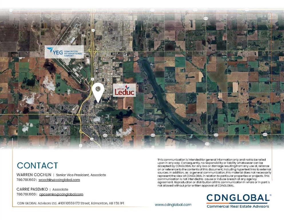 • 5,500 square foot freestanding building on 2.58 acres in Leduc's East Industrial area. Shop features floor drains, air lines, ventilation fans, and two 12’ x 16’ grade loading doors. Fenced and graveled yard area. Site features two access points to 44A Street, and one access point to 43rd Street. Light industrial zoning allows for a variety of uses. Low site coverage