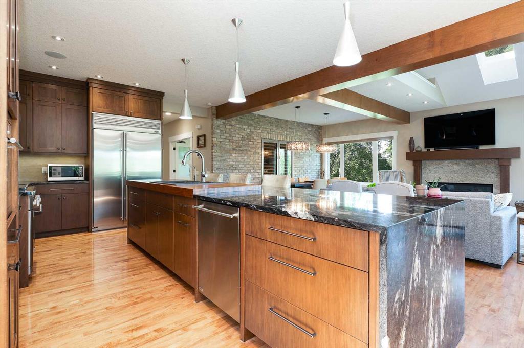 Unprecedented location siding & backing onto picturesque Confederation Park! This gracious 3+1 bedroom home with FULLY DEVELOPED WALK-OUT BASEMENT & over 3800 sq ft of developed living space, underwent a “to the studs” renovation in 2015 & exudes elegance. The open & airy main level is adorned with hardwood floors, showcasing a living room with beamed vaulted ceiling with skylights & feature fireplace. The spacious dining area with brick feature wall & built-in Sub-Zero wine fridge has ample space to host f...