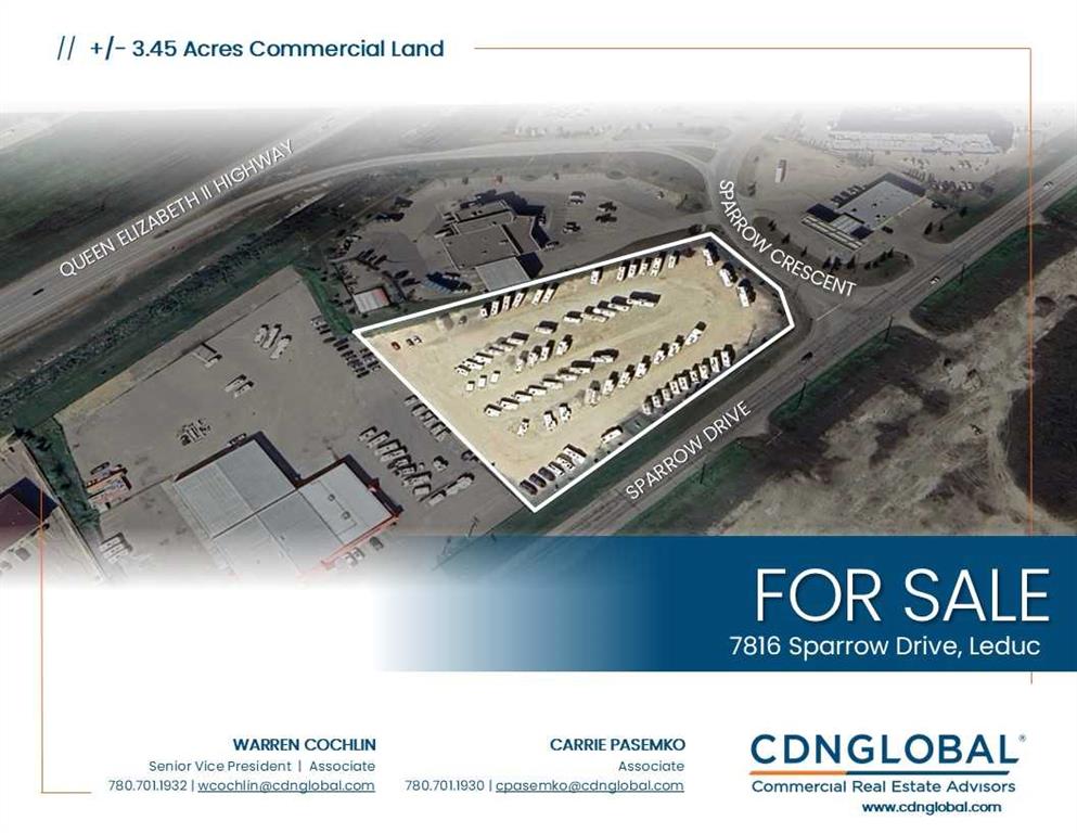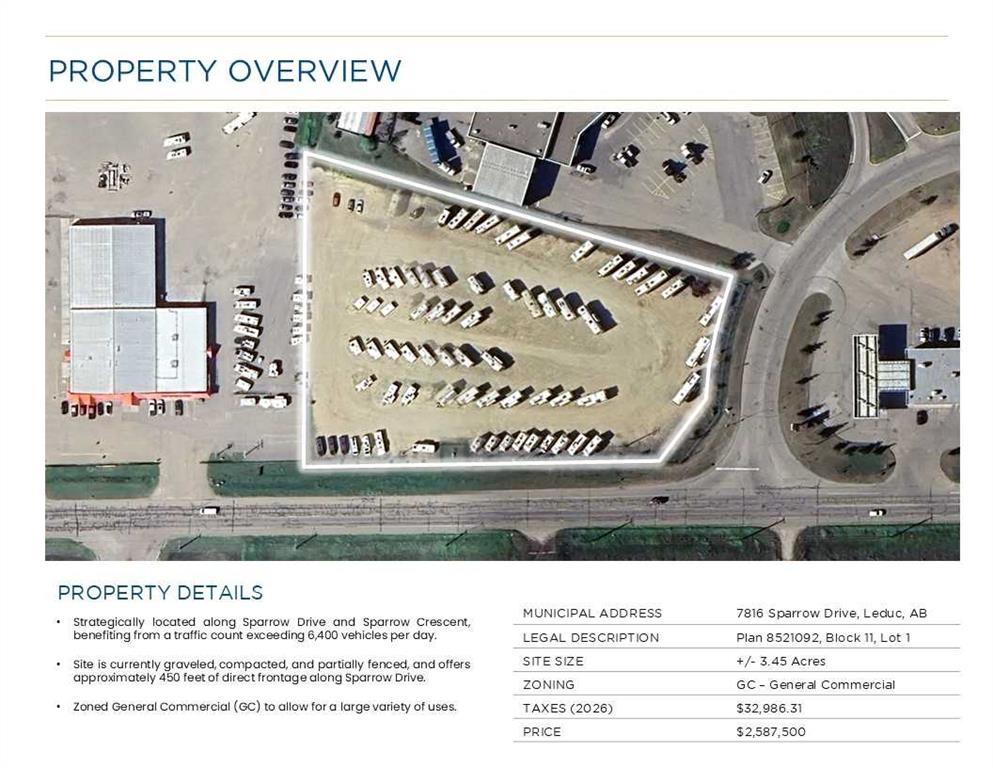 Strategically located along Sparrow Drive and Sparrow Crescent, benefiting from a traffic count exceeding 6,400 vehicles per day. Site is currently graveled, compacted, and partially fenced, and offers approximately 450 feet of direct frontage along Sparrow Drive. Zoned General Commercial (GC) to allow for a large variety of uses.