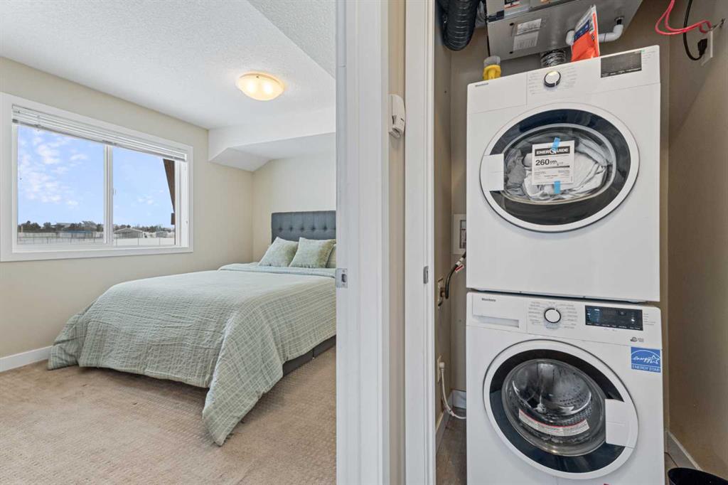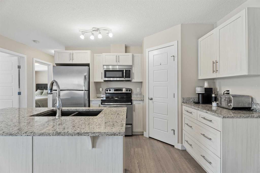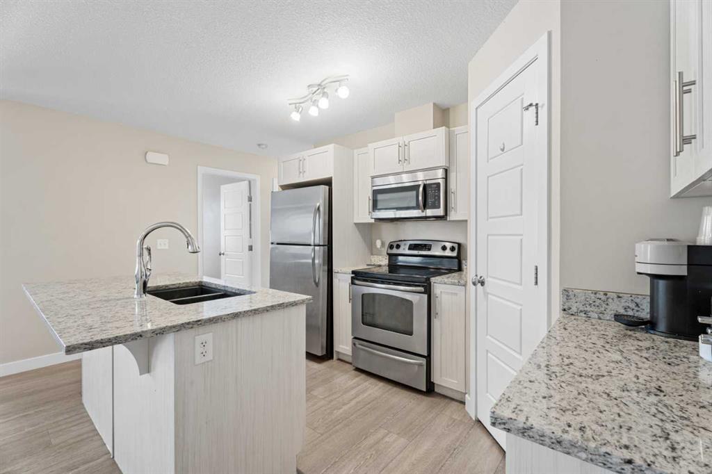 Located in the Chinook Crossing complex in Prairie Springs, this 2 bedroom, 2 bathroom stacked townhouse offers low-maintenance living with an upscale feel perfectly positioned beside Chinook Winds Regional Park. A private entry leads up to a bright, open-concept main level with a comfortable living area and a stylish kitchen featuring white cabinetry, stainless steel appliances, a corner pantry, and a centre island with breakfast bar, as well as plenty of space to style a dining area to suit your lifestyle...
